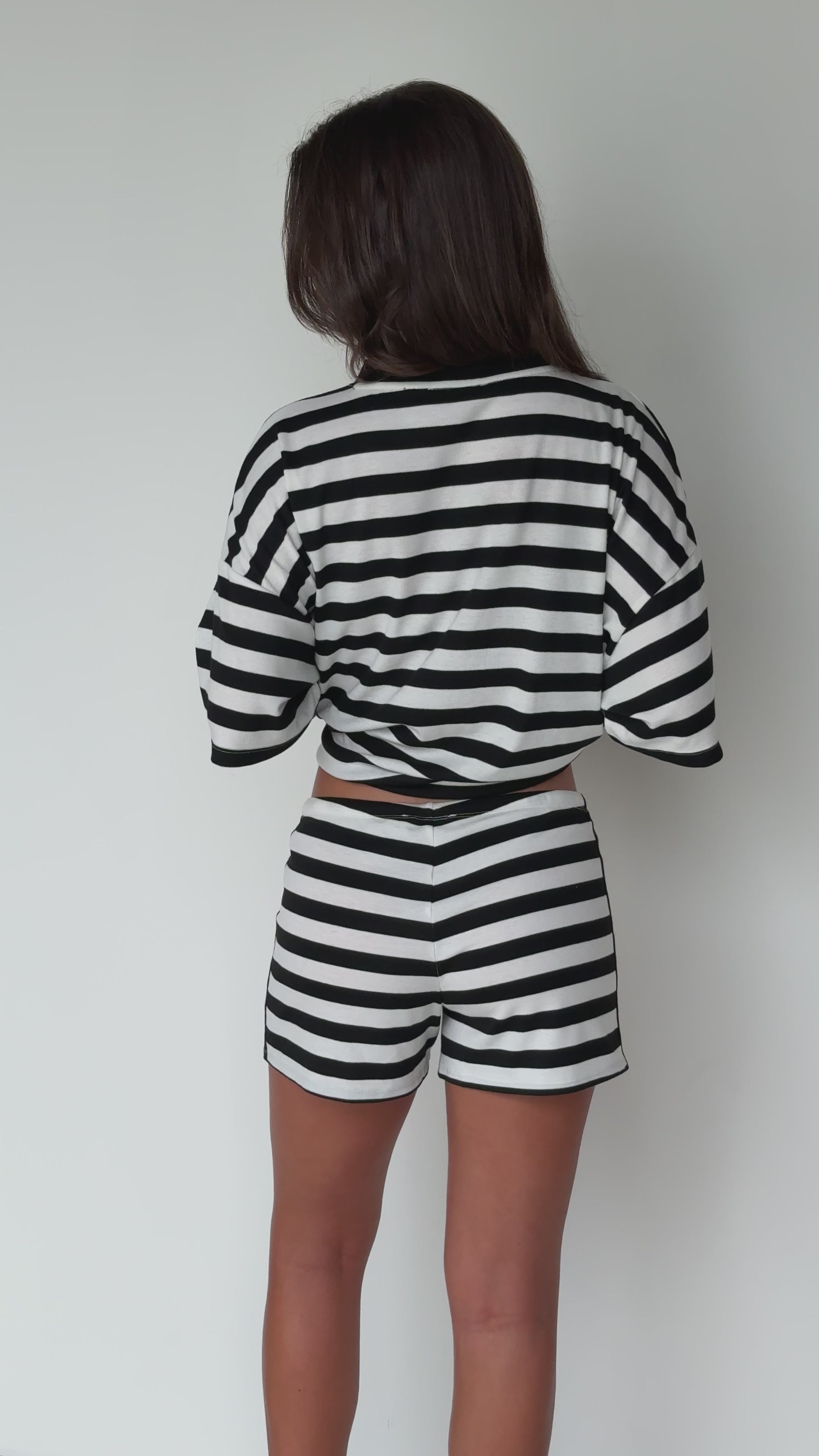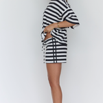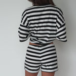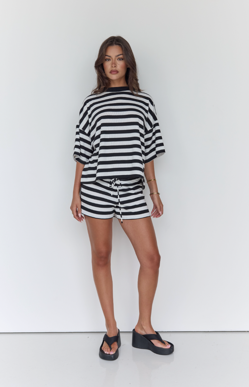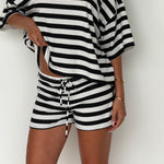 Soft, flattering, and a little cheeky — these striped shorts are made for lounging, running errands, or heading out with friends! Pair with the matching tee for a set, or mix with a crop top, oversized shirt, or blazer — basically, they go with everything. X