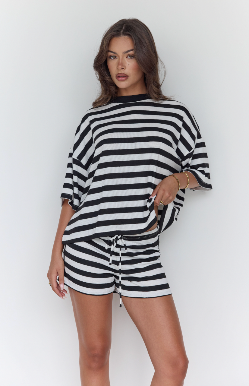 This black-and-white striped tee is buttery soft, relaxed, and effortlessly cool. For the days when choosing an outfit is too much, she’s that perfect in-between Tee. The relaxed tee pairs perfectly with the matching shorts, giving you a coordinated look that feels like it was made for you X