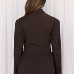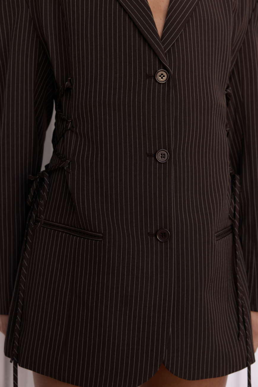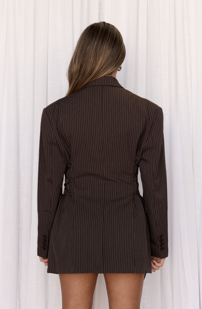 Say hello to your newest obsession: The Lace Up Brown Stripe Blazer. Long-line and slightly oversized with flirty lace-up sides, designed for versatility and made to move X Pair with knee-high boots for a look that owns the night or layer over the Brown Stripe Fold over Pants to complete the set!