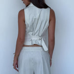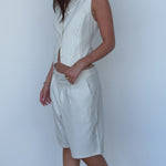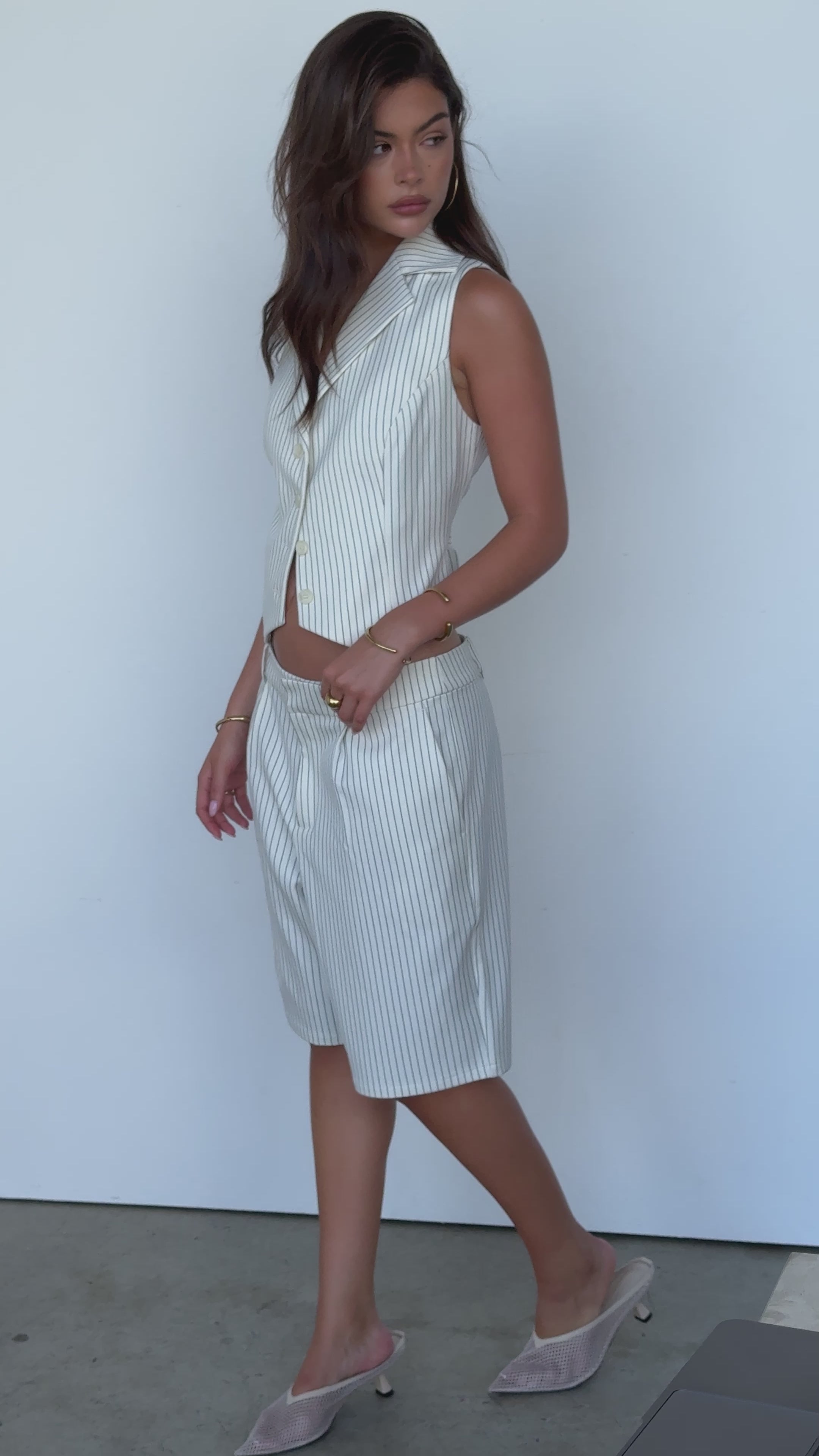 Our new fav waistcoat, crafted and tailored to fit like a glove, featuring a cute neckline collar for a little extra 90’s corp core! Our custom created cream pinstripe beaut is perfect for pairing with denims, whites, or darks–whatever you’re into sis.