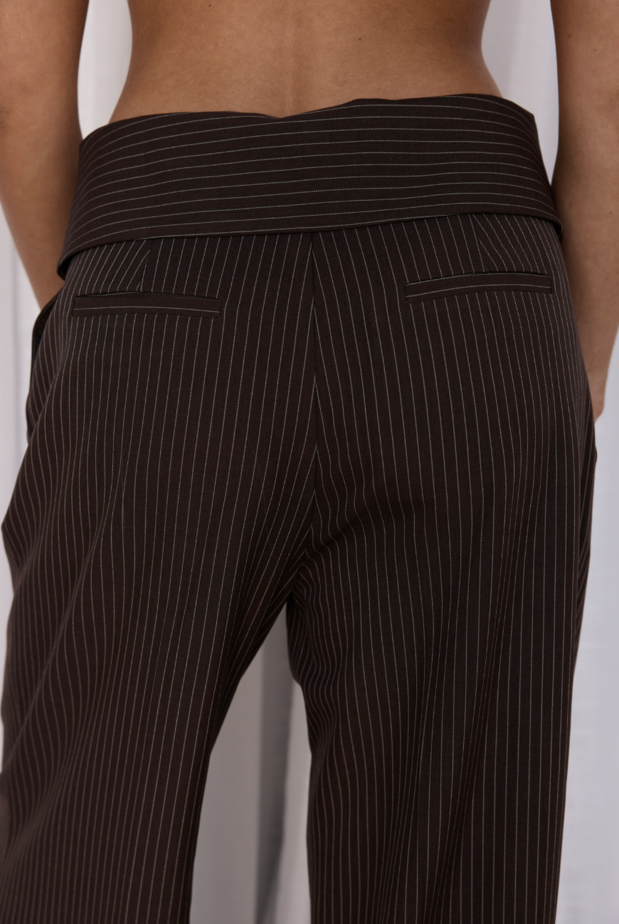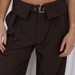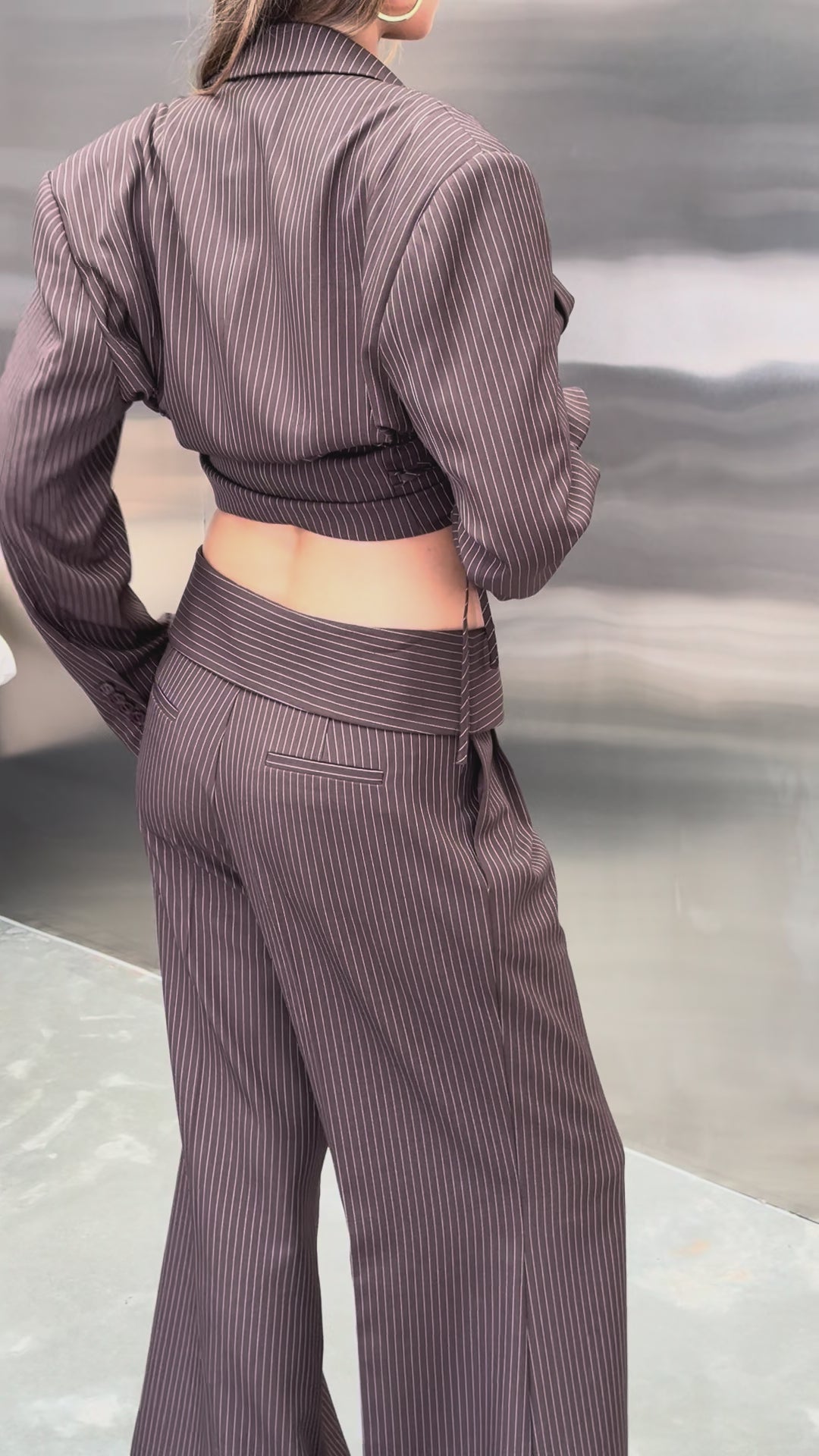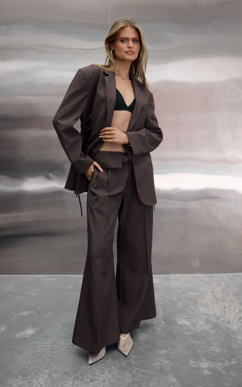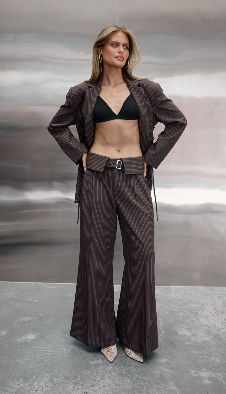 Your wardrobe just leveled up - the pair you’ll reach for on repeat! The Brown Stripe Pant features a pinstripe print and a silhouette that flows just right — cinched at the waist and wide through the leg. Wear with the matching blazer or a cropped tank — either way, she’s a standout X