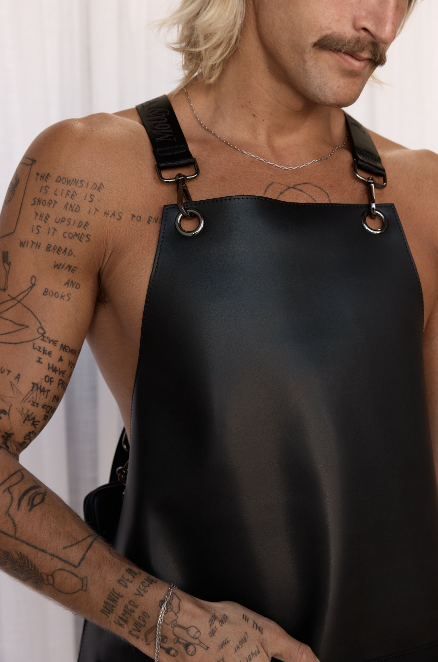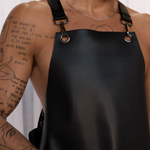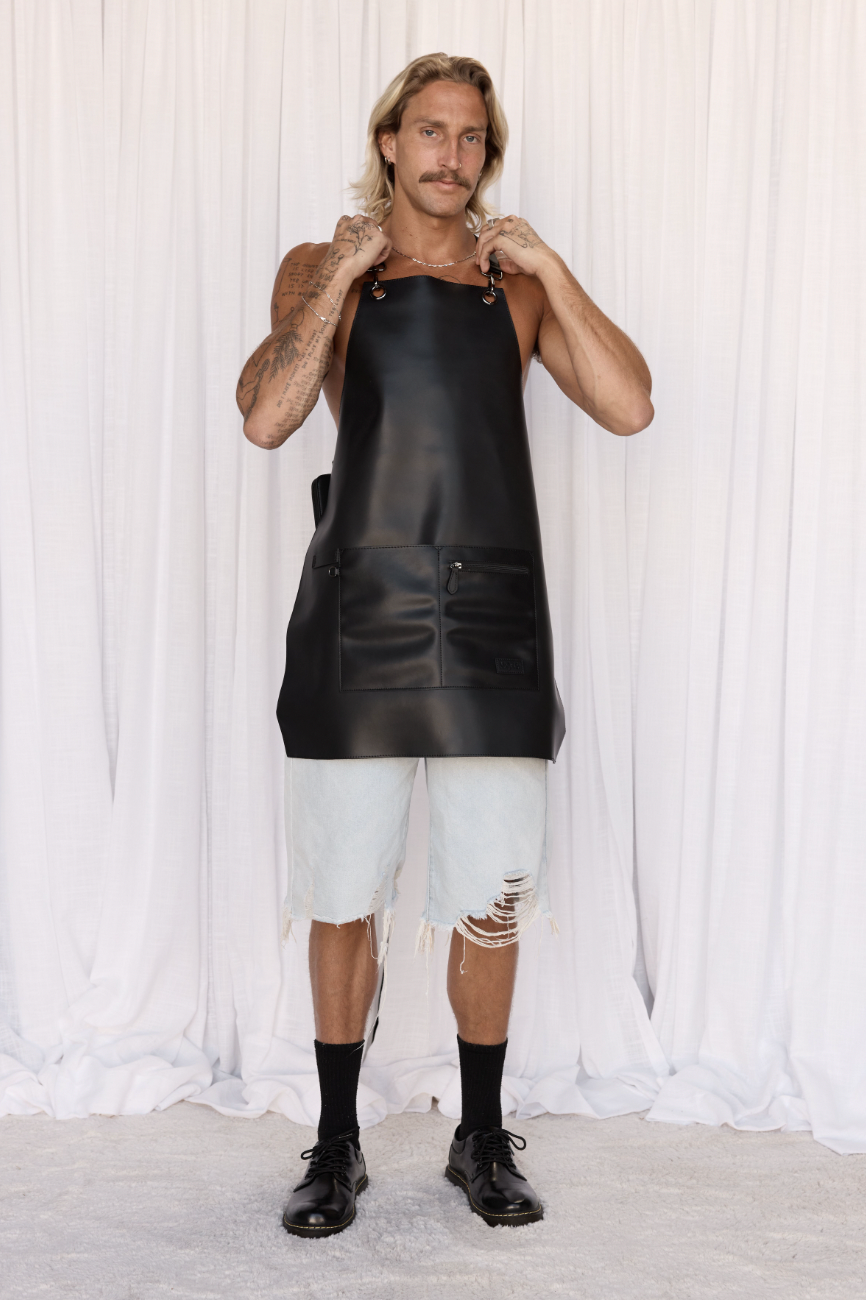 The Iconic Comfort Apron in Classic Black- Thoughtfully designed and made in the highest quality vegan leather, the Comfort Apron is designed to last, whilst breathable, bleach proof and will keep you comfy while you create, its a dream to wear from the start of work to the finish.